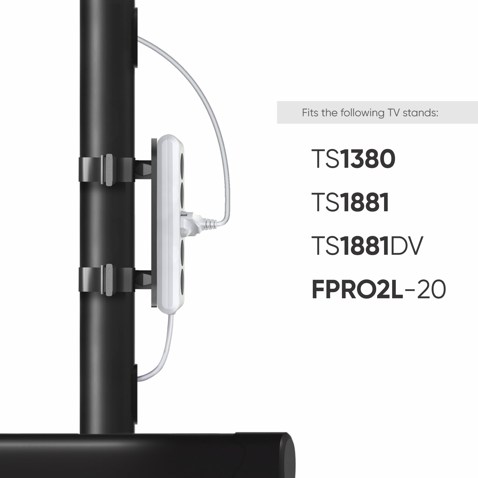 Uchwyt montażowy listwy zasilającej kompatybilny ze stojakami TV ONKRON TS1881, TS1892, TS3881. Maksymalne obciążenie 4,4 funta, średnica kolumny montażowej 1,96 cala, pasuje do większości przedłużaczy i listew zasilających lub ochronników przeciwprzepięciowych.