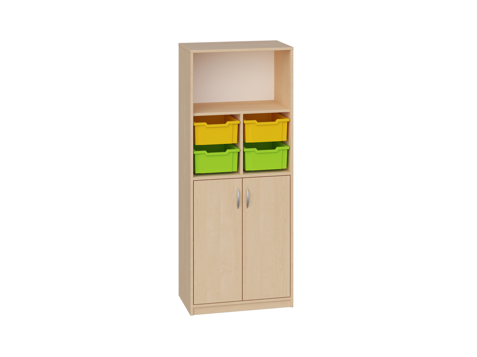 Regał z pojemnikami i szafką ULTRA 213 u góry otwarta półka, poniżej 4 średnie pojemniki plastikowe, poniżej 2 półki do przechowywania. Wykonany z płyty gr. 18 mm, tyła biała płyta HDF gr. 3,5 mm. Wymiar (WxSxG) 1756x704x450 mm. Meble posiadają certyfikat dopuszczający do użytkowania w jednostkach oświatowych.