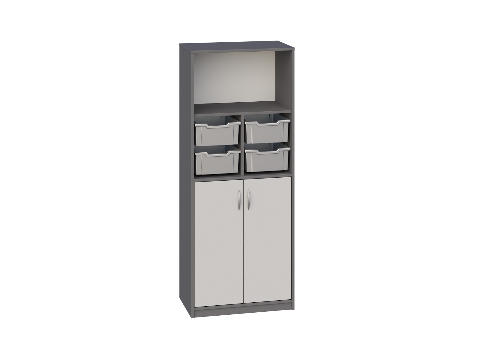 Szafka z drzwiczkami w kolorze białym i szarym oraz metalowe zaokrąglone uchwyty.