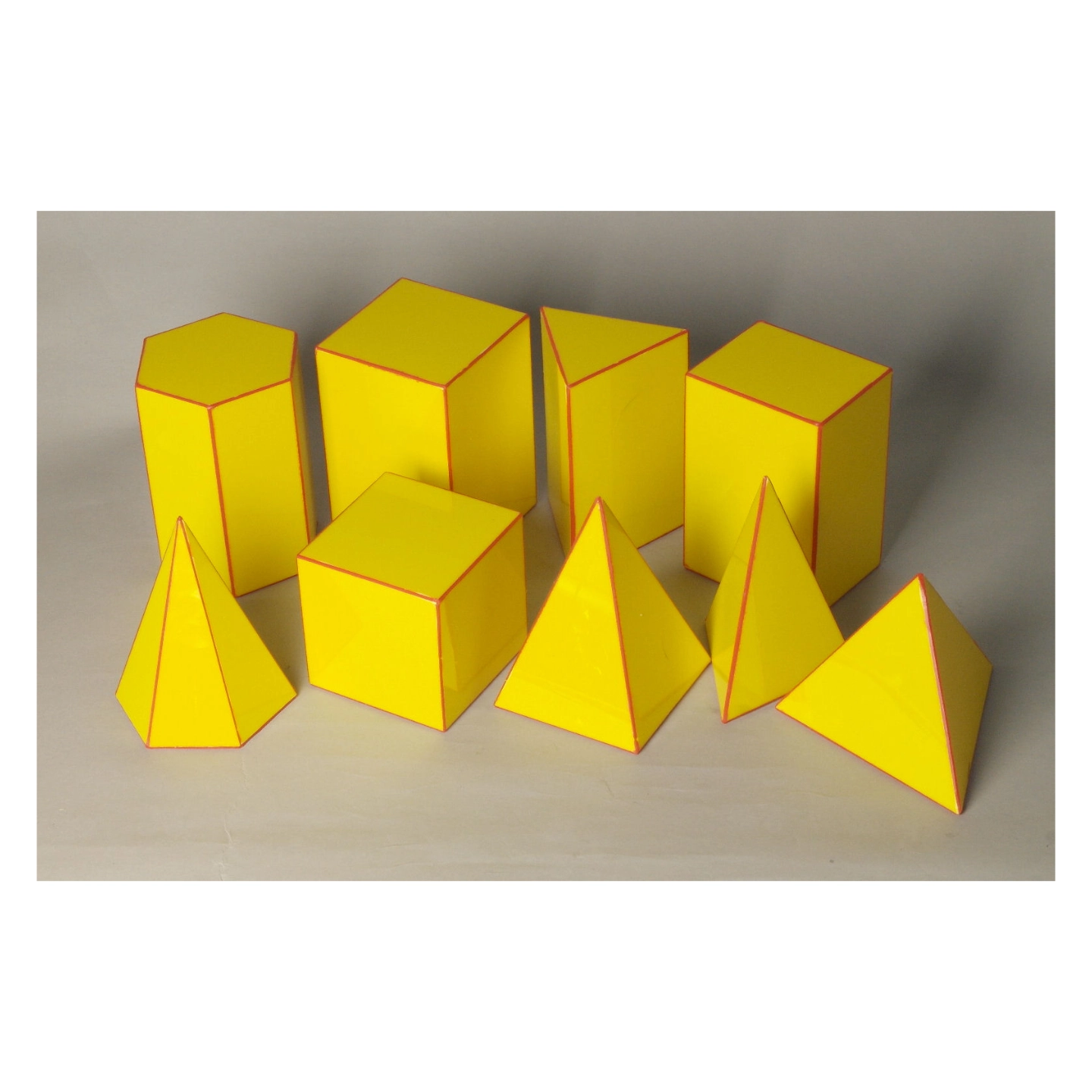 W skład zestawu wchodzą podstawowe ostro i graniastosłupy oraz bryły foremne o podstawach kwadratu, trójkąta, sześciokąta, prostokąta