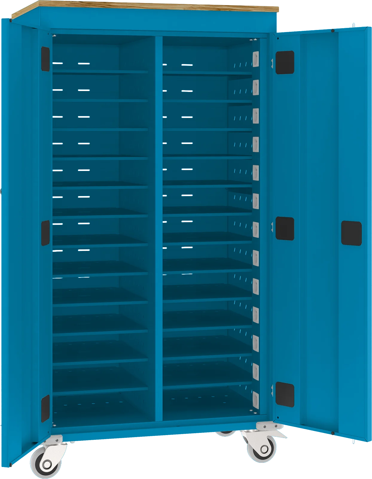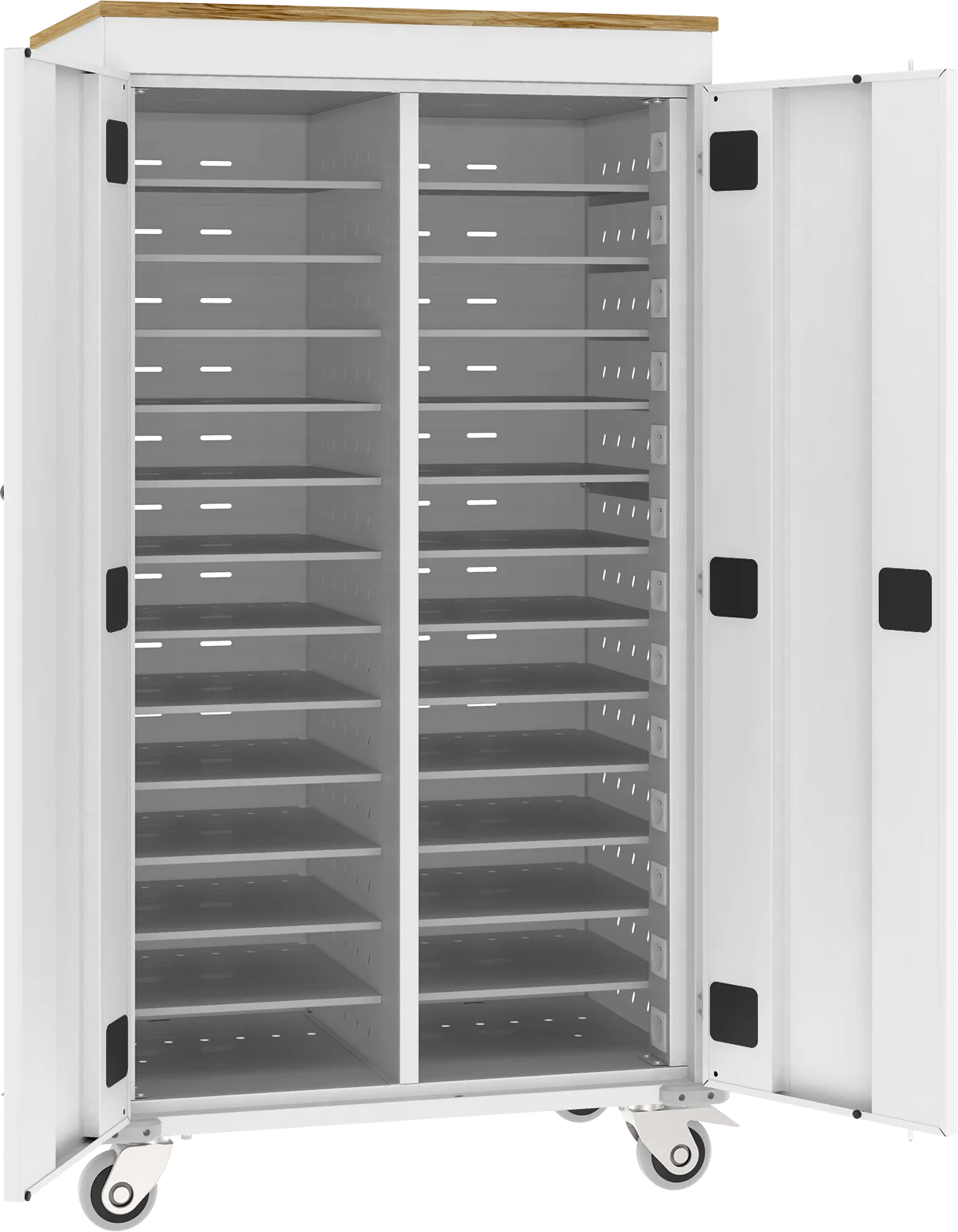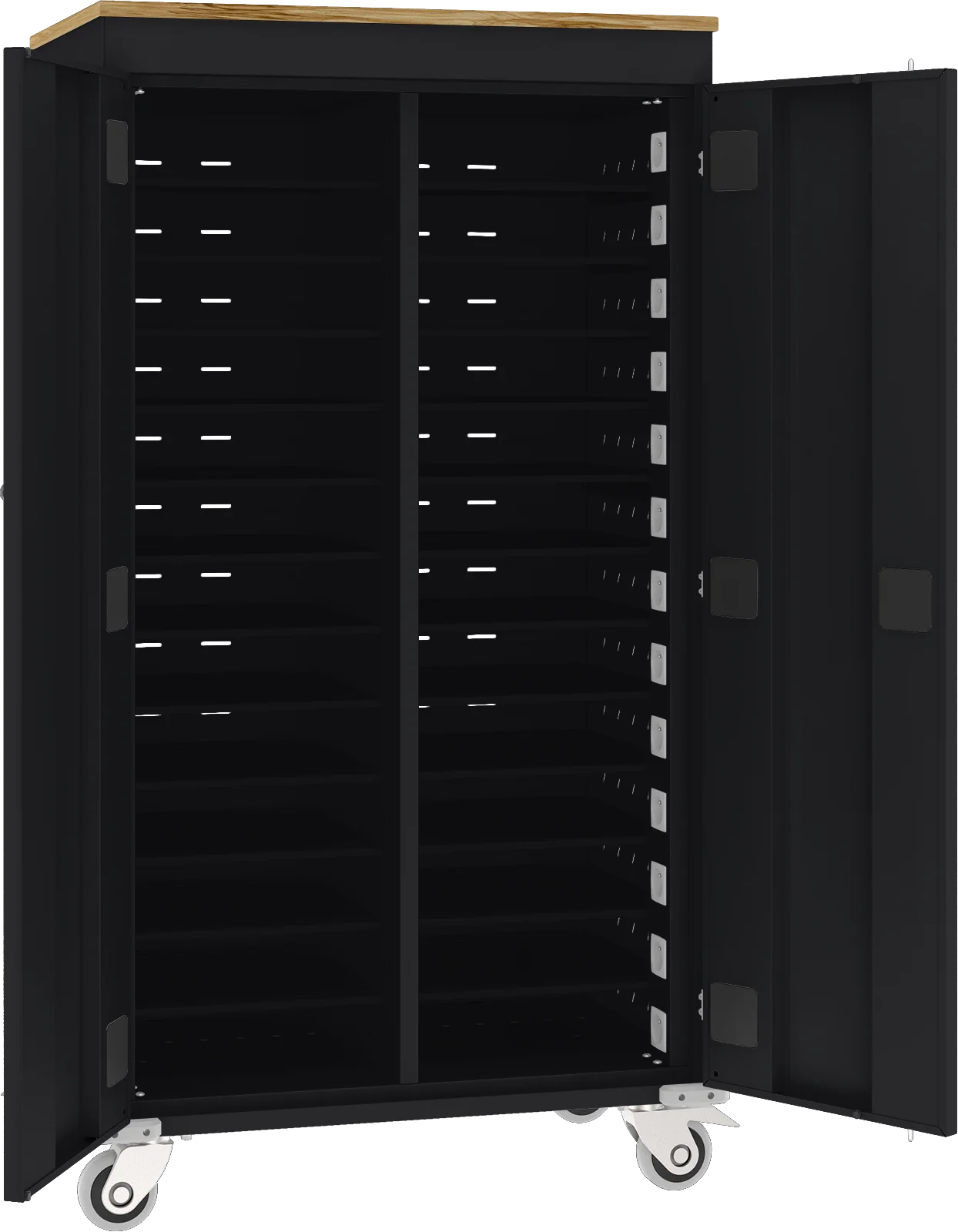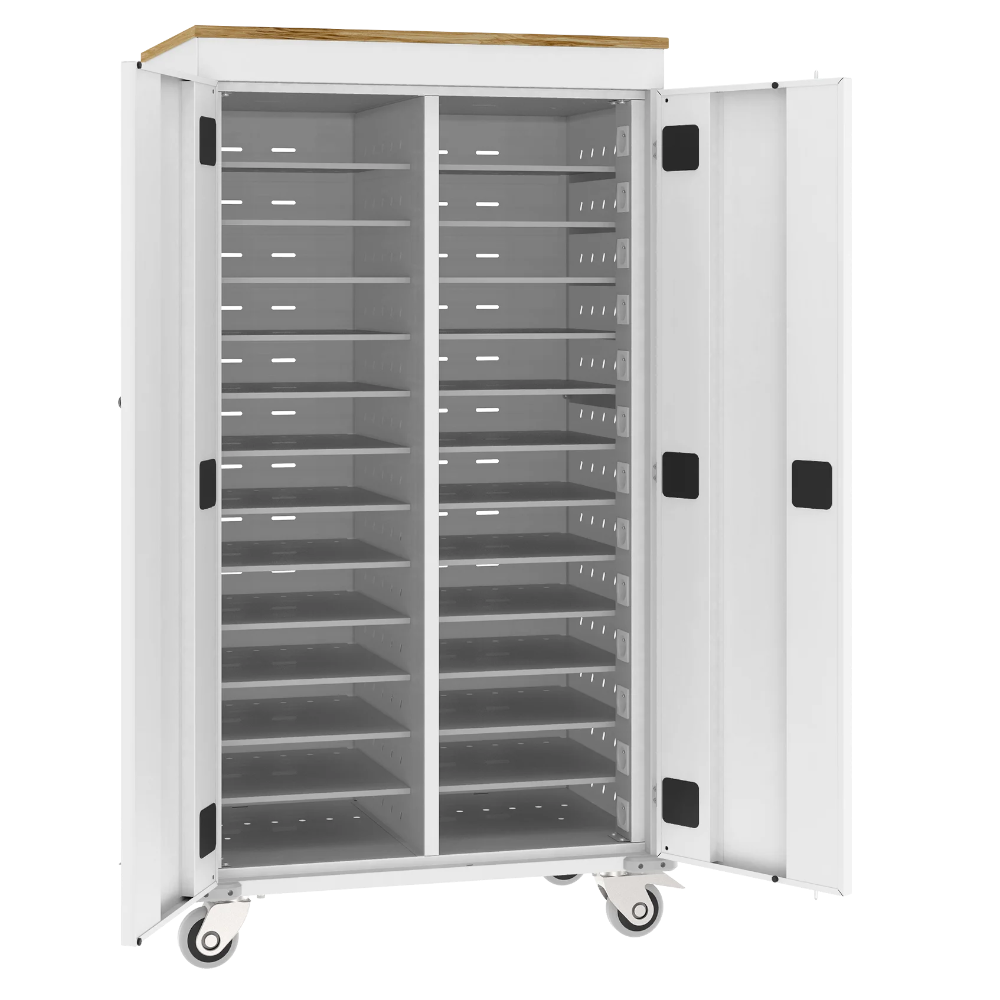 Wózek na laptopy z funkcją ładowania baterii służy do przechowywania i łatwego przewożenia laptopów. Sprawdza się idealnie w szkołach, na uczelniach, bibliotekach czy salach konferencyjnych, czyli wszędzie tam, gdzie istnieje konieczność bezpiecznego przechowywania i jednoczesnego ładowania laptopów. Zawartość szaf jest chroniona przez drzwi wyposażone w zamek. Przemieszczanie wózka jest możliwe, dzięki 4 skrętnym kołom (w tym 2 z blokadą) i uchwytom na bokach urządzenia. Wózki WNL mogą przechowywać i ładować jednocześnie od 10 do 30 laptopów. Bezpieczeństwo w czasie ładowania zapewnia bezpiecznik oraz moduł ładowania sekwencyjnego. Perforacja na obudowie wózka zapewnia odpowiednią cyrkulację powietrza wewnątrz. Wózek przykryty blatem z płyty wiórowej 18 mm, dostępnym w 6 kolorach oklein. Wózki dostępne w 16 kolorach RAL w standardzie.