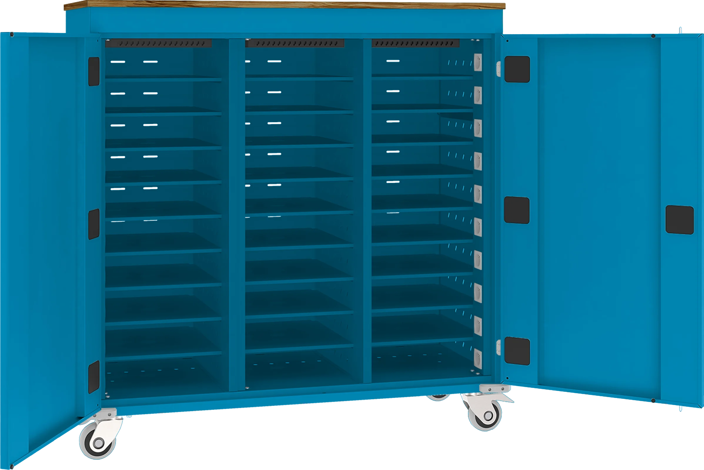 Wózek na laptopy z funkcją ładowania baterii służy do przechowywania i łatwego przewożenia laptopów. Sprawdza się idealnie w szkołach, na uczelniach, bibliotekach czy salach konferencyjnych, czyli wszędzie tam, gdzie istnieje konieczność bezpiecznego przechowywania i jednoczesnego ładowania laptopów. Zawartość szaf jest chroniona przez drzwi wyposażone w zamek. Przemieszczanie wózka jest możliwe, dzięki 4 skrętnym kołom (w tym 2 z blokadą) i uchwytom na bokach urządzenia. Wózki WNL mogą przechowywać i ładować jednocześnie od 10 do 30 laptopów. Bezpieczeństwo w czasie ładowania zapewnia bezpiecznik oraz moduł ładowania sekwencyjnego. Perforacja na obudowie wózka zapewnia odpowiednią cyrkulację powietrza wewnątrz. Wózek przykryty blatem z płyty wiórowej 18 mm, dostępnym w 6 kolorach oklein. Wózki dostępne w 16 kolorach RAL w standardzie.