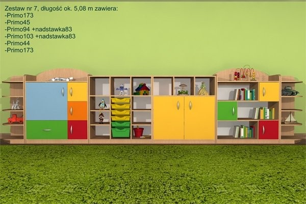 Zestaw mebli przedszkolnych nr 7 o długości ok. 5,10 m, składający się z następujących mebli (od lewej na zdjęciu):