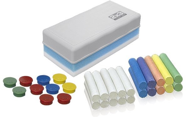 Zestaw zawiera: wycierak do kredy, magnesy (10 szt.), 2 komplety kredy (białej i kolorowej – po 10 szt.).